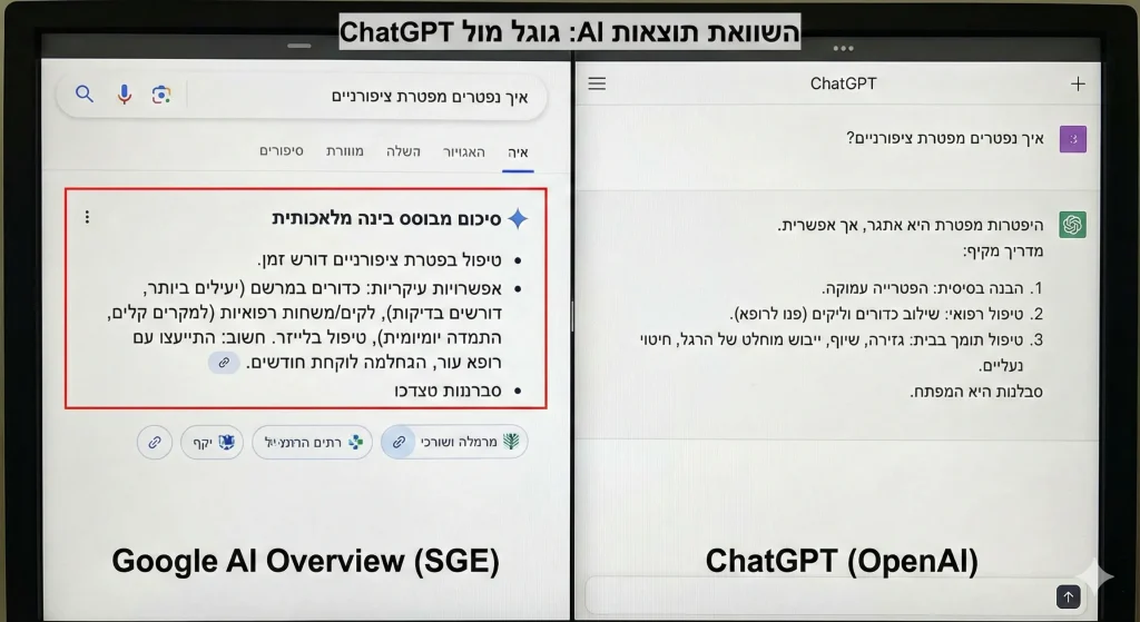 - מריצים שאילתות מפתח ב-AI Overviews/AI Mode, Chat GPT ו-Perplexity, רושמים מי מצוטט/מקושר.
