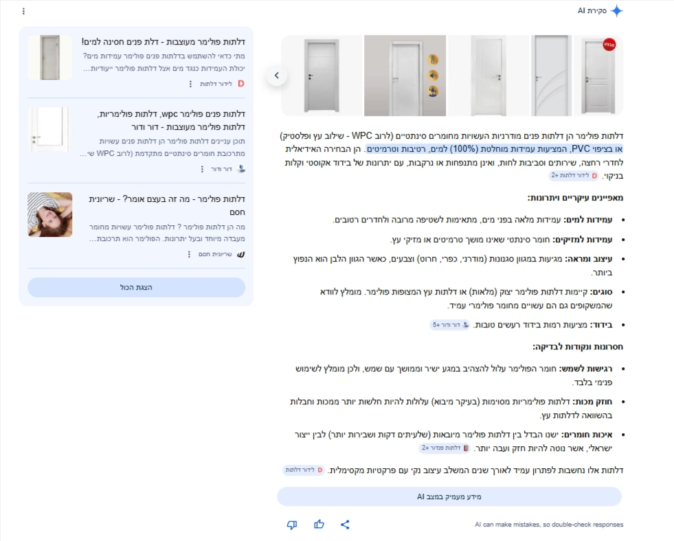 דוגמא ללקוח שלנו בתוצאות AI overviews – (דור ודור דלתות)